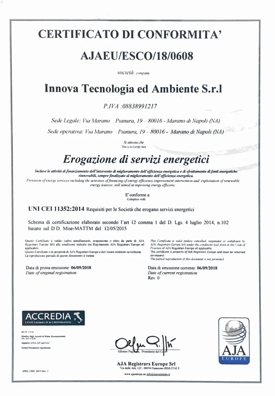 Fondata con la missione di offrire soluzioni concrete e innovative nel settore energetico ed edilizio, Innova Tecnologia & Ambiente SRL ha intrapreso un percorso di crescita che l’ha portata a diventare una Società ESCO certificata (Energy Service Company). Questo riconoscimento rappresenta non soltanto una qualifica formale, ma un impegno concreto a garantire ai nostri clienti interventi di efficienza energetica completi, misurabili e duraturi.